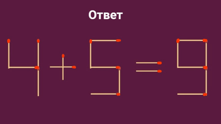 Решение довольно любопытное. Вам стоило взять одну спичку из второго слагаемого и переместить её к результату. Таким образом, 4 плюс 5 будет равняться 9. Арифметика и справедливость восторжествовали.