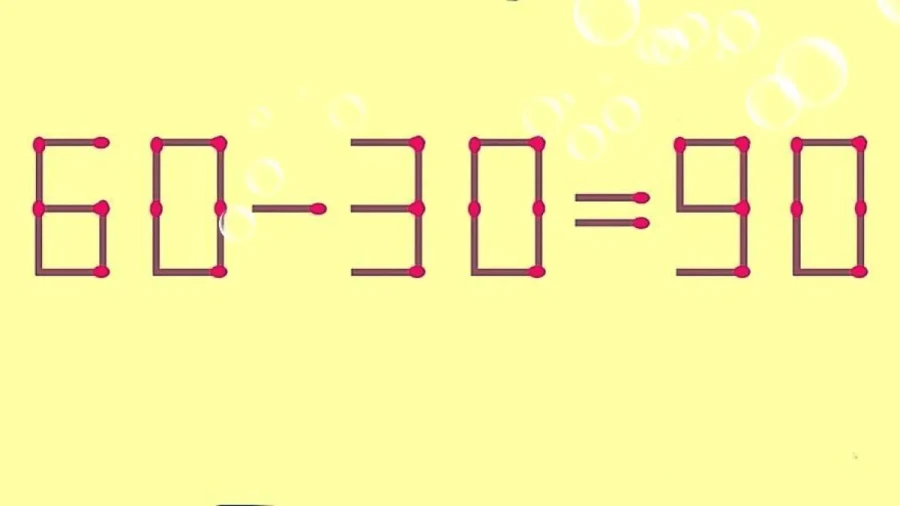 на картинке записано неверное равенство — 60 − 30 = 90. Задача простая по условию, но требует быстрой оценки формы цифр и умения мысленно переставлять элементы — всего одна спичка решает проблему. Время выполнения — 20 секунд; для тренировки можно не ограничивать себя во времени и искать решение спокойно.
