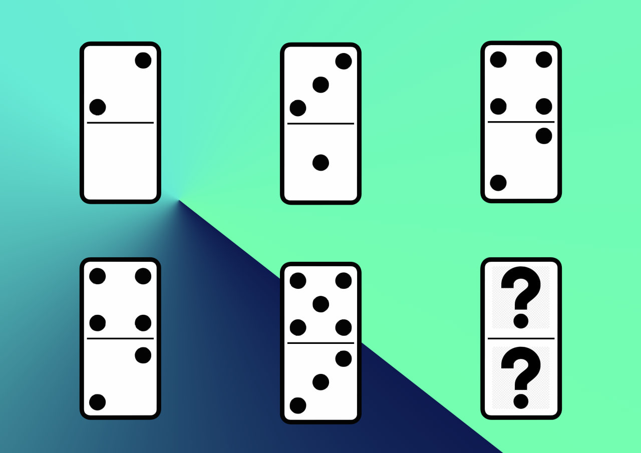 Попробуйте решить одну из них. Перед вами последовательность, в которой закрыта одна из костей. В этом раскладе есть определенная закономерность, которую нужно раскрыть. Это поможет понять, какая «доминошка» закрыта.