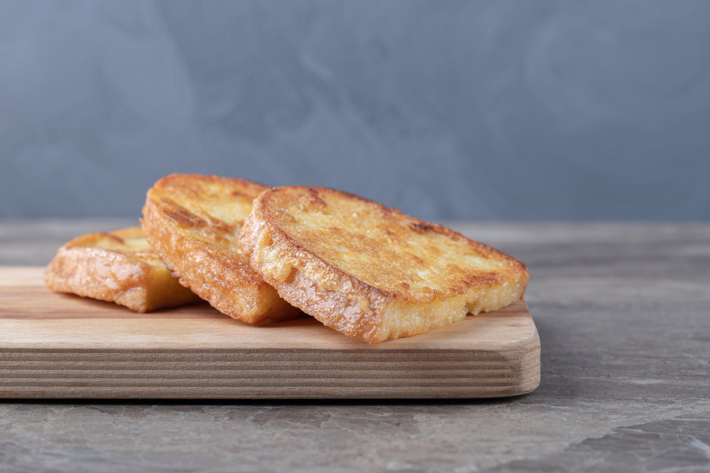 Хлеб опускаем в смесь и держим по несколько секунд с каждой стороны. Кладём хлеб на сковородку с уже растопленным сливочным маслом, поджариваем хлеб с обеих сторон по 2 минуты, крышка не нужна.