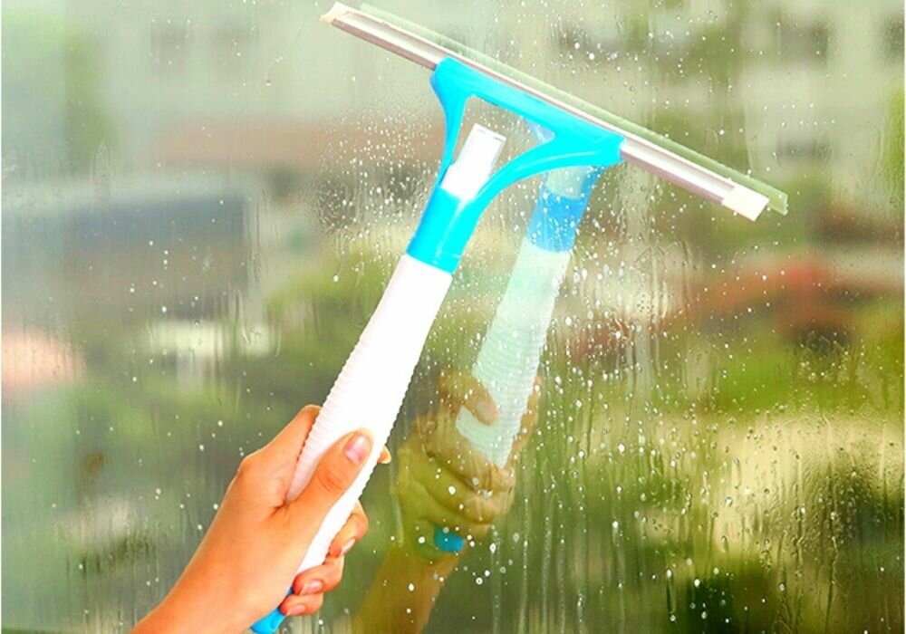 Далее моем окна с помощью губки. После берём в руки резиновый скребок для окна и избавляемся от остатков воды.