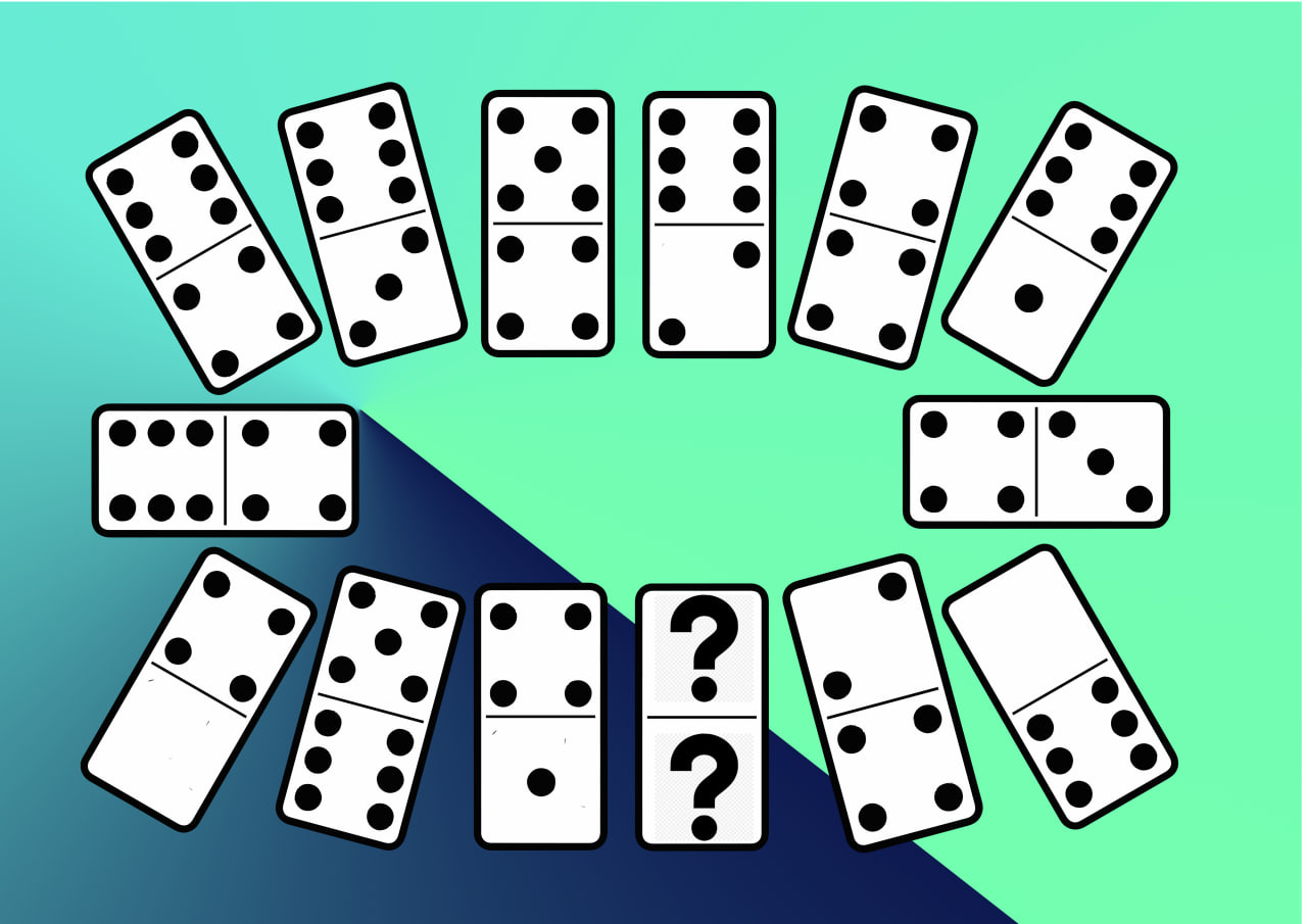 Поэтому сегодня мы предлагаем вам решить одну из самых сложных задачек с домино. Перед вами изображение с рассыпанными костями. Мы видим все, кроме одной. Но если подключить логику, то станет понятно, что мы точно знаем, какого она номинала.