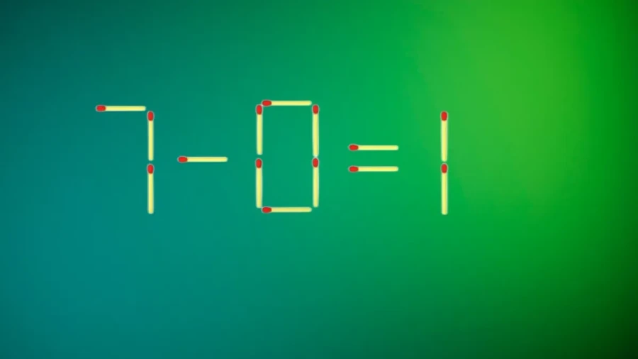 Перед вами запись «7−0=1», которая специально неверна. Чтобы сделать равенство правильным, достаточно одной аккуратной перестановки. Нужно снять вертикальную спичку с цифры «7» и перенести её так, чтобы знак минус превратить в плюс.