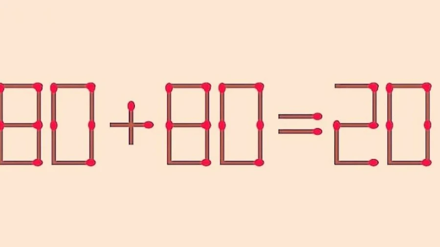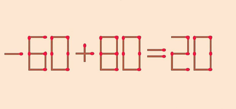 Берут одну спичку из первой цифры 8. Тогда первая восьмёрка превращается в шестёрку. Та же спичка используется как знак минус перед числом. В результате получается запись: −60+80=20.