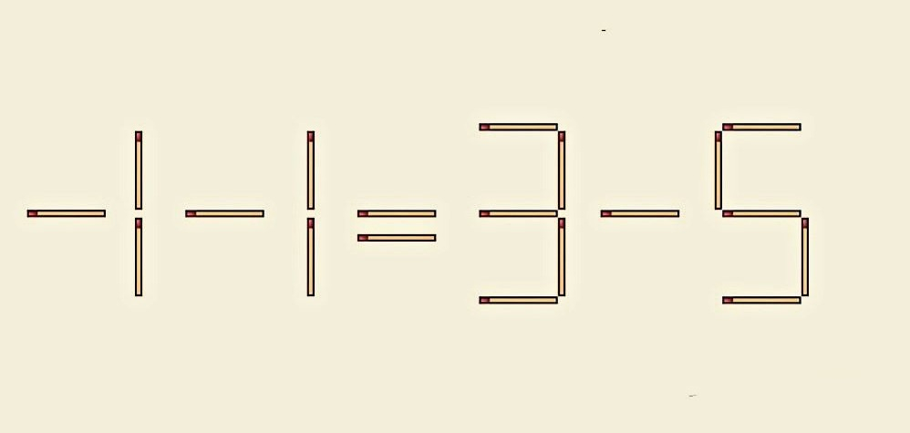 Решение требует креативного подхода. Если превратить знак сложения в вычитание, правая часть равенства станет «-2». Остаётся подправить левую часть. Если все сделали именно так, то у вас получится пример «-1-1=3-5».