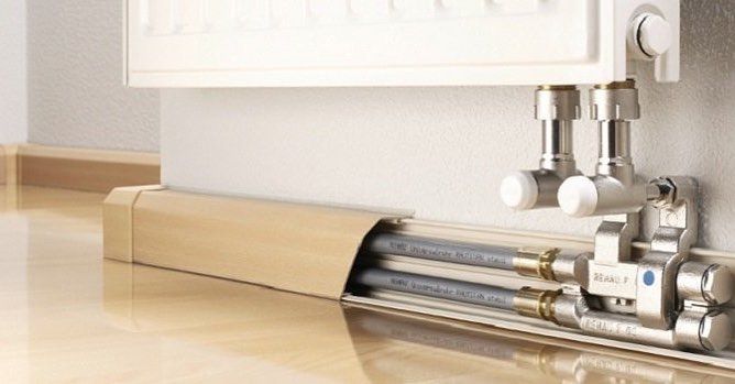 Нам надо лишь выбрать материал и красиво закрыть трубы. Предлагается выбрать напольный полимерный плинтус. У него достаточно высокая плотность, и это более экономичный вариант, чем ГКЛ-короба.