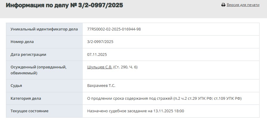Басманный суд Москвы 13 ноября рассмотрит вопрос о мере пресечения бывшему вице-губернатору Новгородской области Станиславу Шульцеву. Информация опубликована в карточке дела.