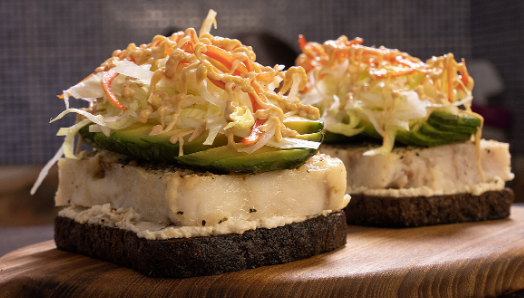 Готовый чеснок нужно выдавить и смешать с творожным сыром. И у вас получится нежный намаз. Рыбу ломаем на крупные куски и авокадо режем тонко. На хлеб чесночный крем, минтай, авокадо немного, айсберга и перца чили.