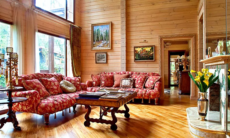 Просторная гостиная украшена диванами с резными ножками. Здесь же красуется винтажный журнальный столик. Большое количество естественного света пробивается в комнату через панорамные окна. Особый шарм добавляет каменный камин.