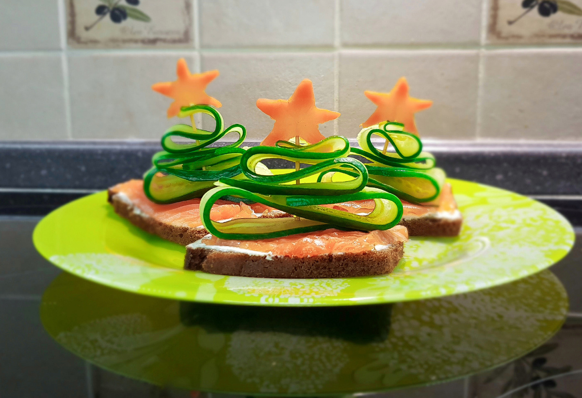 На кусочек хлеба наносят слой творожного сыра, кладут рыбу — кто как любит, лишь бы легла ровно и не расползлась. Потом уже ставят саму огуречную ёлочку и закрепляют морковную вершинку.