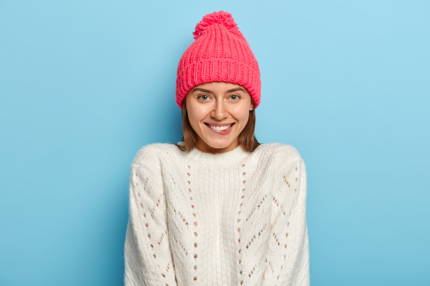 Сама по себе она объёмная, поэтому отлично выглядит с простой минималистичной одеждой. Шапка крупной вязки становится полноценным акцентом вашего образа и притягивает к себе внимание. Стоит отдать предпочтение природным цветам. Это молочный, оливковый, персиковой и т. д.