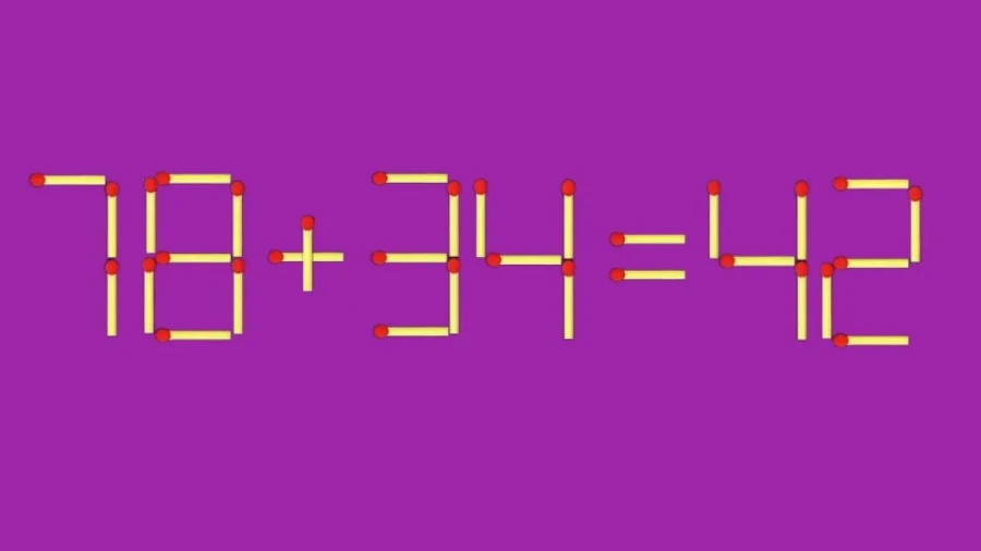 На картинке мы видим равенство «78+34=42». На первый взгляд кажется, что дело в сложении, но настоящая хитрость скрыта в форме цифр. Исправить ошибку можно, передвинув лишь одну спичку: обычная «4» превращается в «11».