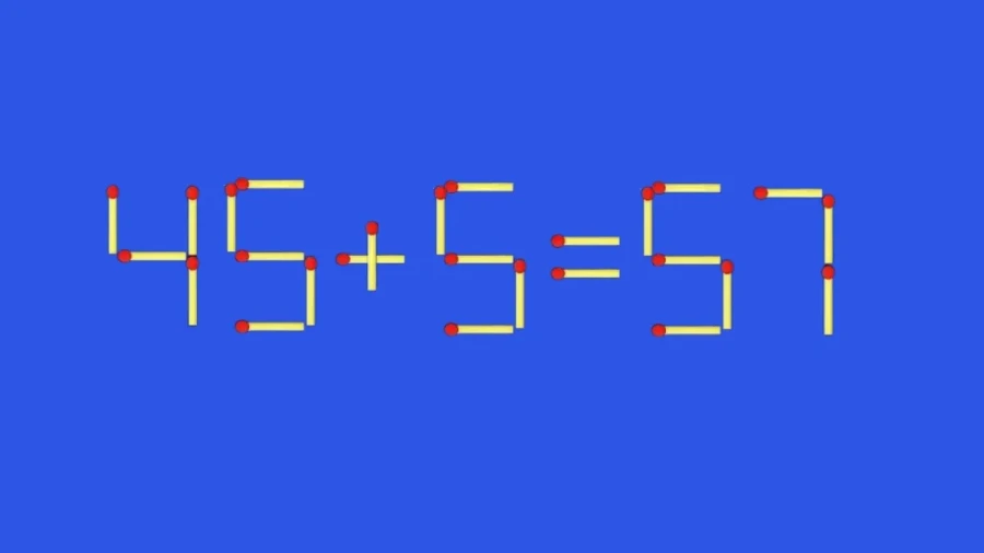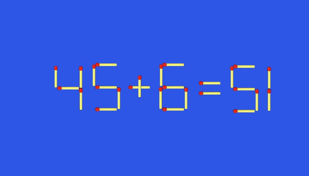 На иллюстрации изображено равенство «45+5=57», в котором допущена ошибка. Да, его можно исправить, но трогать разрешают лишь одну спичку.