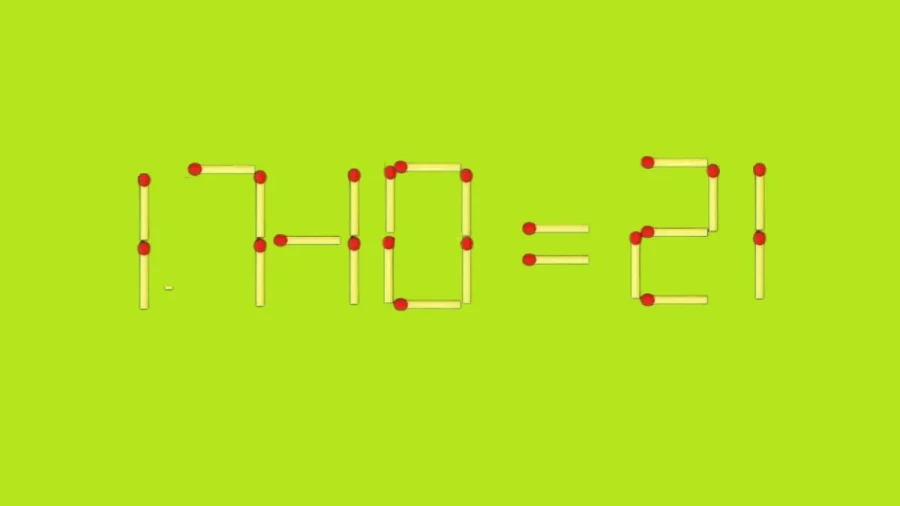 Перед вами равенство «17-10=21». На иллюстрации видно, что здесь допущена ошибка. Чтобы исправить её, достаточно передвинуть одну спичку. На первый взгляд кажется сложно, но смекалка подскажет верный ход.