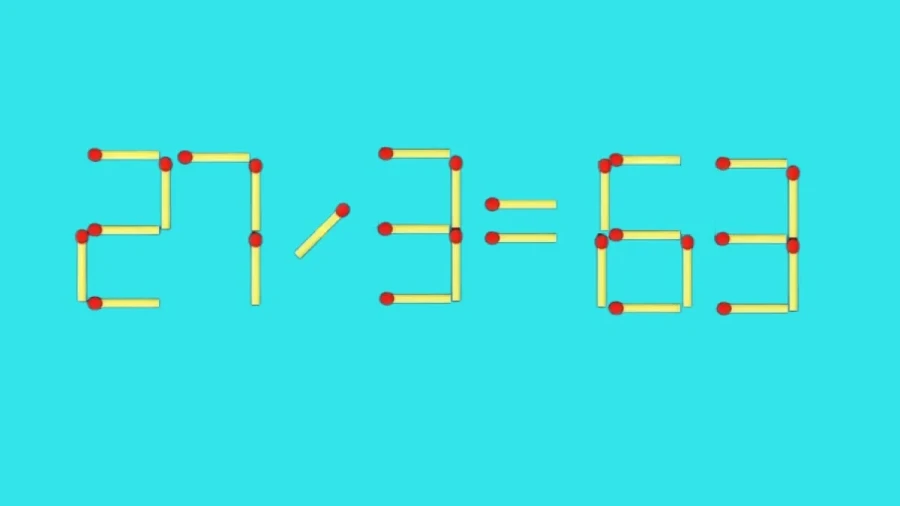 На иллюстрации показано равенство «27/3=63». Сразу понятно, что тут глупейшая ошибка. Прямое исправление числа не поможет. Вам нужно передвинуть одну спичку и все встанет на свои места.