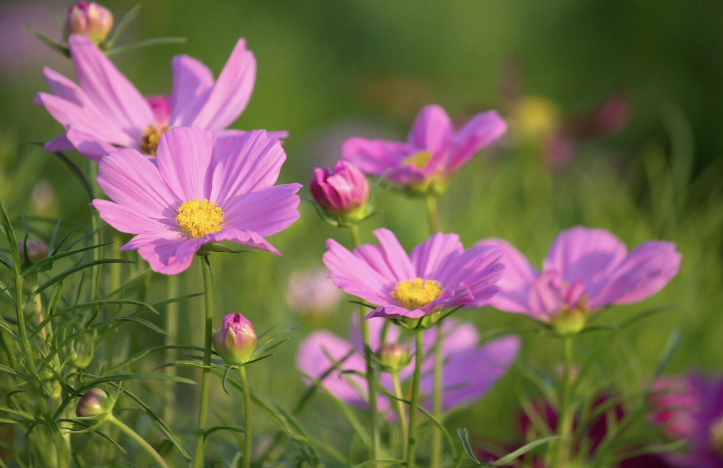 Космея — популярные цветочки, которые чем-то напоминают ромашки. Растут на солнышке и уживаются на многих типах почв, высота у них от 50 до 150 сантиметров, а также есть разные необычные виды.