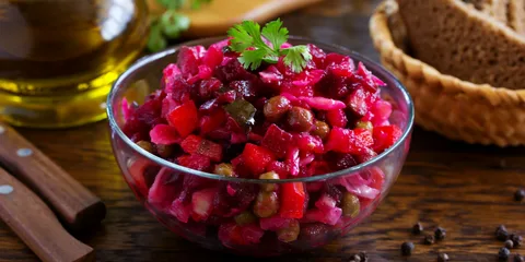 Винегрет. Ещё один из коронных салатов советской кулинарии. Готовился быстро и из продуктов, которые практически всегда были под рукой. Для заправки использовали растительное масло.