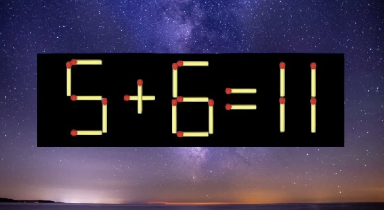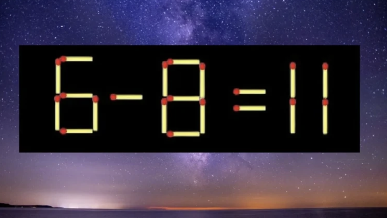 Взгляните на иллюстрацию — там представлено равенство «6-8=11». Однако все мы понимаем, что пример построен неправильно. Так вот, вам надо его исправить, переложив всего одну спичку и не меняя остальные.
