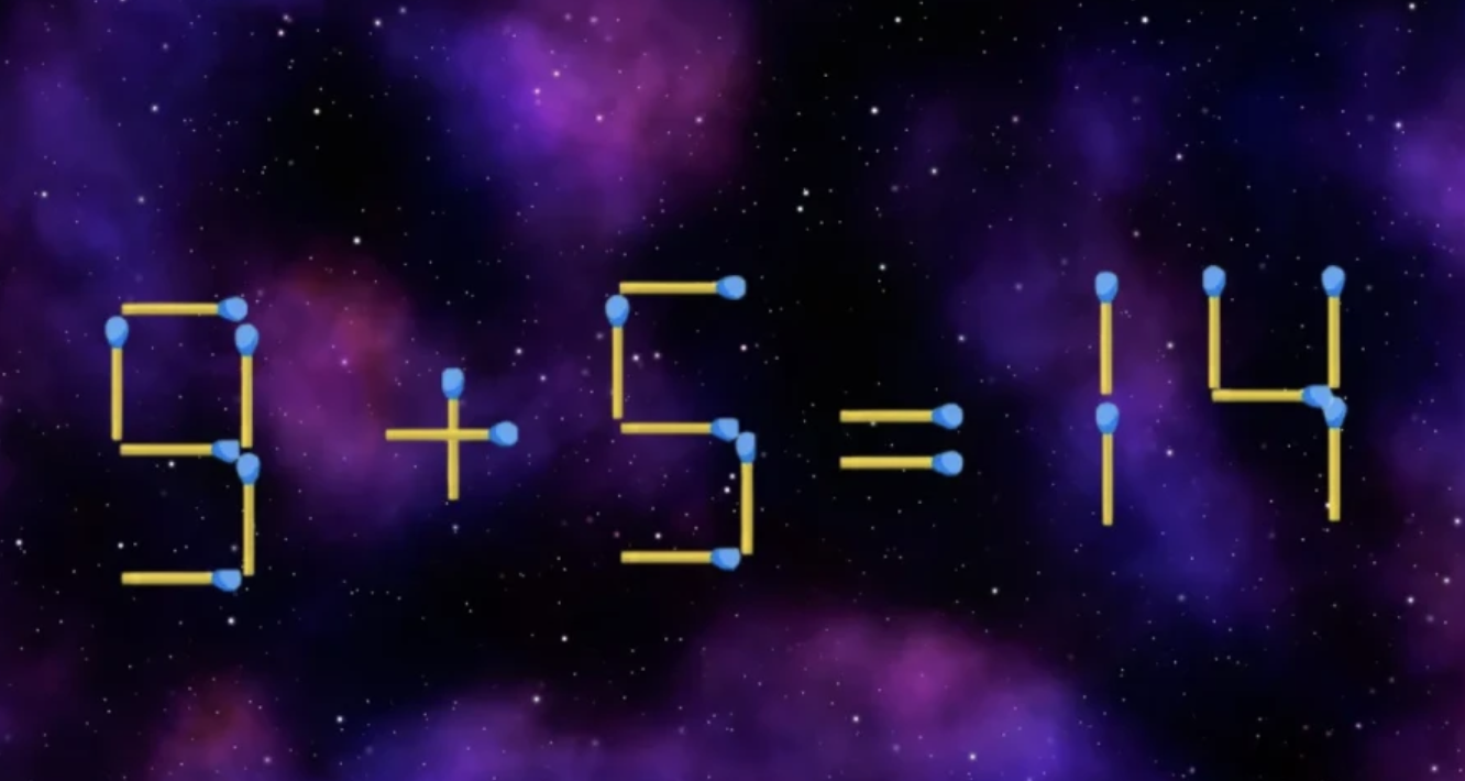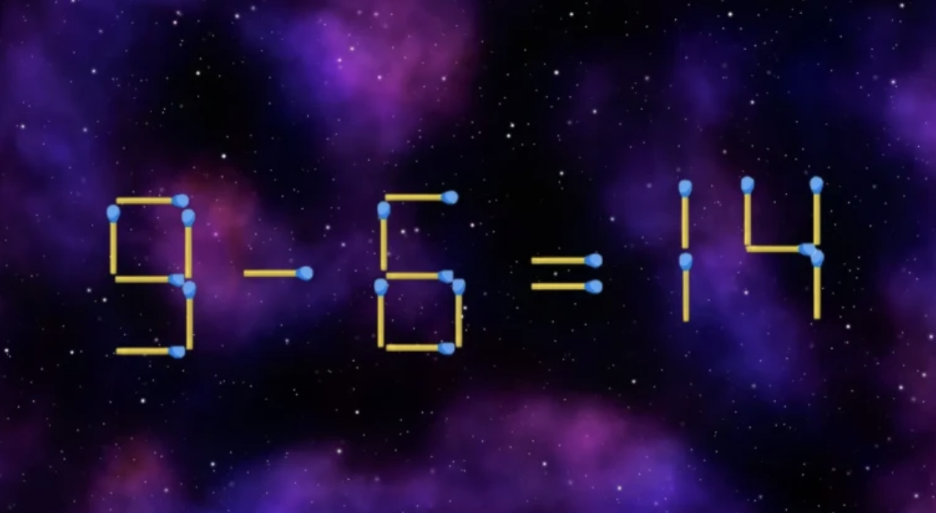 На картинке есть равенство «9-6=14». Вот только 9-6 не равно 14, верно? Вам надо это равенство исправить, а для этого необходимо поменять расположение одной-единственной спички.