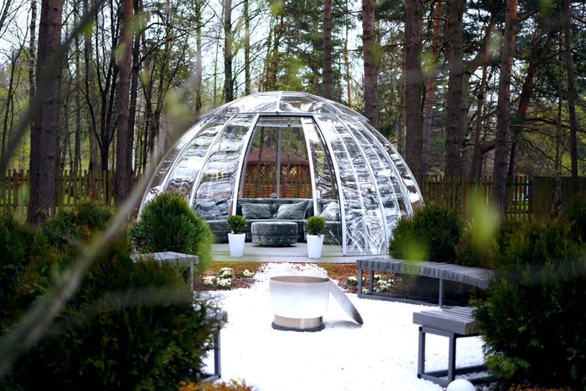 На участке дома есть прозрачная купольная беседка. Внутри установлена мягкая мебель.