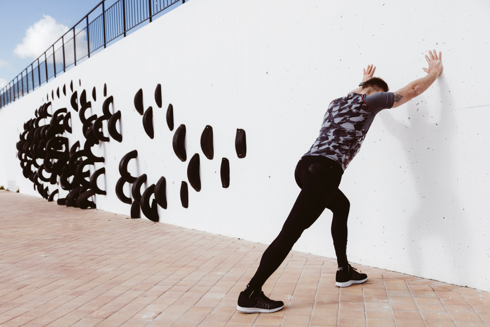 Итак, для выполнения упражнения нам надо сначала встать лицом к стене. Вытягиваем вперёд руки и кладём их на стену, опираясь на них. Ноги ставим на ширине плеч и начинаем ходить. Ноги надо активно поднимать.