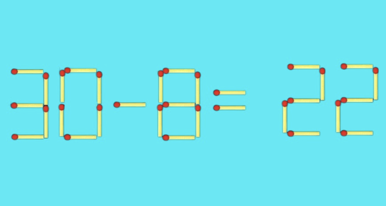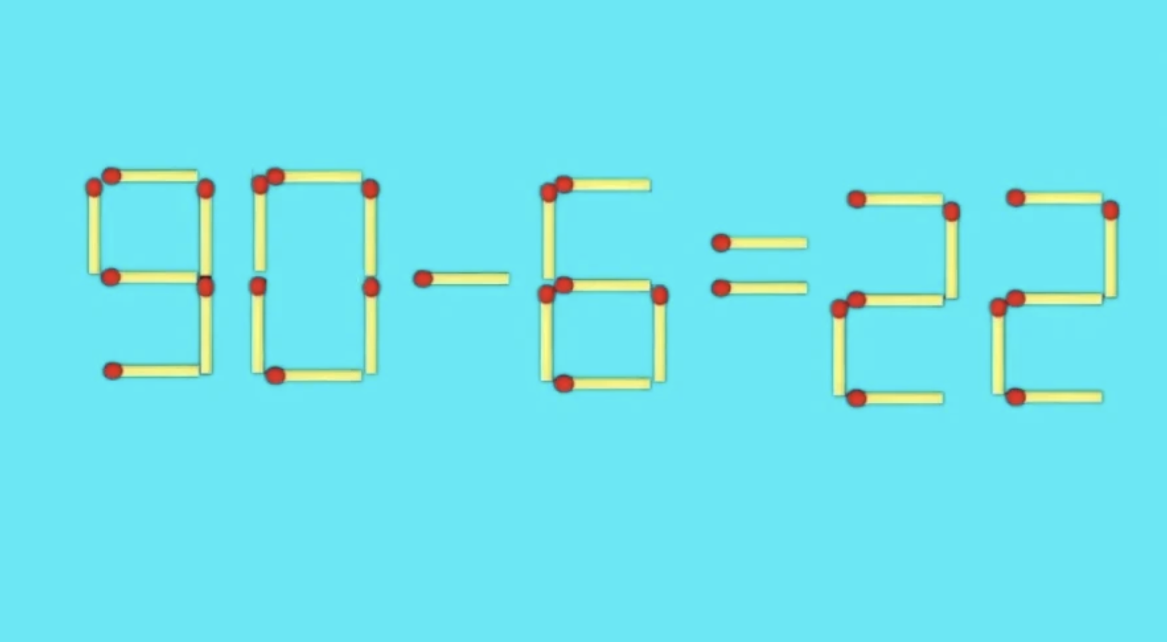 На картинке равенство «90-6=22», в нём специально сделали ошибку. Вам надо эту ошибку исправить, а для этого следует мысленно переложить одну спичку. Попытайте свои силы и решите эту задачку, а правильный ответ будет ниже.