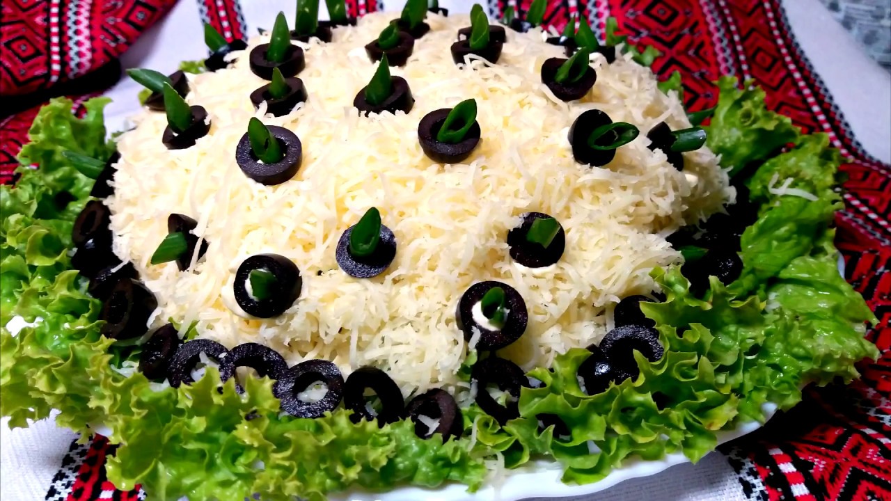 Теперь осталось лишь украсить салат. Для этого используем маслины и натёртый сыр. На этом всё, салат готов.