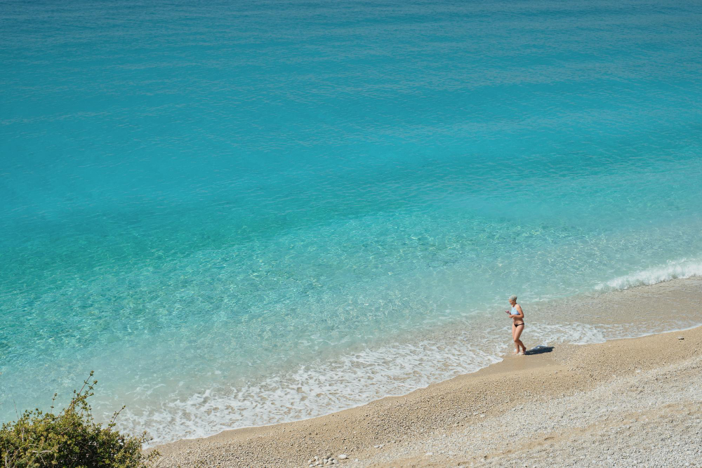 Пляж сплошь покрыт крупной галькой, ходить босиком неудобно, а золотого песка почти нет. Народу полно, все расстилают полотенца прямо на камнях, а вдоль берега ходят торговцы с напитками.