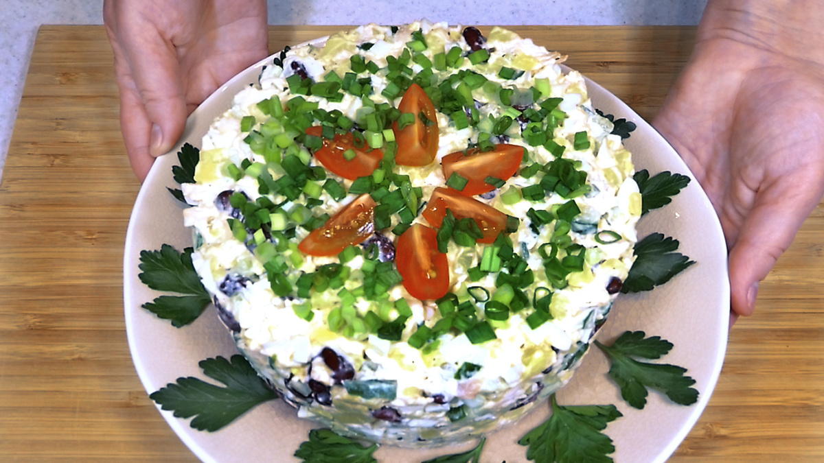 Заправляем майонезом, солим, перчим и перекладываем в любую форму. Украшение зависит от фантазии: зелёный лук, петрушка, дольки помидора придадут салату нарядный вид.