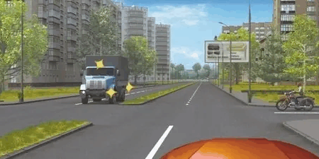 Проезд равнозначного перекрёстка Вы на перекрёстке и хотите проехать прямо. Грузовик слева от вас хочет повернуть налево и у него светится жёлтый маячок. Мотоцикл справа от вас хочет проехать...