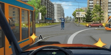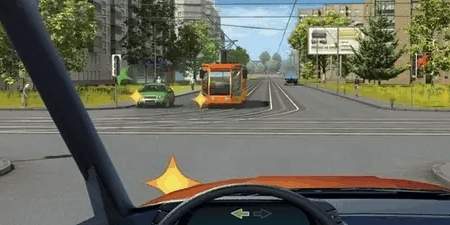 В этом задании просто так не разберёшься Вы хотите повернуть направо через трамвайные пути, но через них проезжает сразу два трамвая с разных сторон. А ещё поворачивает налево...