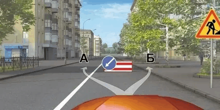 У чего тут приоритет? Вы пытаетесь проехать прямо, но перед вами знак ремонта дороги. Правда, чтобы проехать, как он предлагает, придётся пересечь сплошную. По какой траектории вы должны...