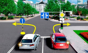 Задача на знание ПДД Разбор задачи по последним изменениям ПДД показывает, кто нарушает на перекрёстке. На Х-образном перекрёстке водитель красного автомобиля собирается повернуть направо, а белого —...