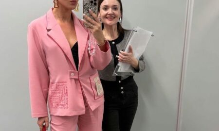 Культовый брючный костюм нежно кораллового цвета, сидел на артистке просто идеально Также певица получила приятный подарок от новгородского бренда – дополнительные аксессуары...